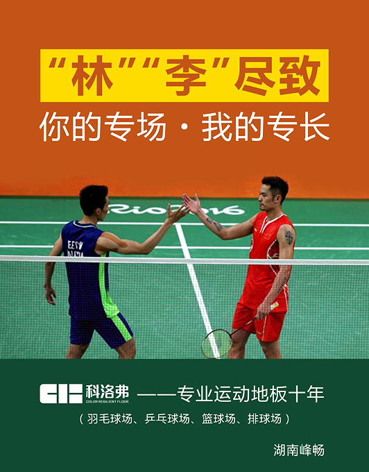 在以后的賽場(chǎng)上,可能再無林、李。但是在羽毛球的賽場(chǎng)上,會(huì)有更多的“林”、“李”譜寫這段傳奇,而專業(yè)羽毛球場(chǎng)地板廠家——科洛弗運(yùn)動(dòng)地板:適用于籃球場(chǎng)、網(wǎng)球場(chǎng)、羽毛球場(chǎng)、乒乓球場(chǎng)、排球場(chǎng),綠色環(huán)保、抗沖擊、吸音、阻燃、防滑、腳感舒適、易清潔,品種多樣。在科洛弗運(yùn)動(dòng)地板上,這是屬于你們的專場(chǎng),我們的專長!